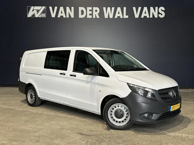 Dealer onderhouden Mercedes-Benz Vito L3H1 Dubbel cabine Euro6 met airconditioning en 5 zitplaatsen. Deze bedrijfswagen is voorzien van cruisecontrol en bluetooth telefoonvoorbereiding. Carrosserievorm: Bestelauto; 7 versn., Automaat; Modeljaar: 2019; Achterwielaandrijving; 100 kW; 330 Nm; 4 cilinders; 2.143cc; Gewicht: 2.081kg; Laadvermogen: 1.119kg; GVW: 3.200kg; Max. trekgewicht: 2.000kg; L3H1; Wielbasis: 343cm; 70l tank; Interieur: zwart, Stof; 5 zitplaatsen; 6,8 l/100km; 8 l/100km; 6 l/100km; 202 g/km CO₂; Euro 6; Dealer onderhouden (onderhoudsboekjes aanwezig); Aantal eigenaren: 2; APK: tot feb. 2027; 2 sleutels (2 handzenders); Wegenbelasting: € 192p/kwrt; vanaf € 303 p/m (informeer naar de mogelijkheden en voorwaarden); Optioneel afleverpakket: Garantiepakket 1 (€ 695 ex BTW); VFD-73-S