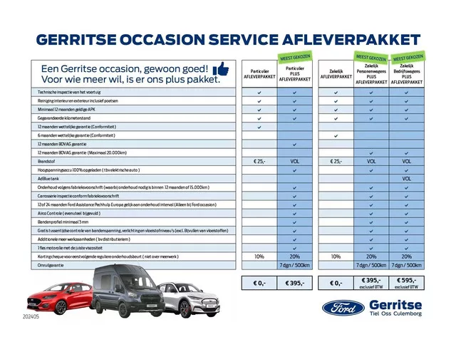Met drie vestigingen in Tiel, Oss en Culemborg is Gerritse de Ford dealer in het rivierengebied. Naast Ford personen- en bedrijfswagens, Ford Service en onderdelen zijn wij in Tiel Ford Transit Centrum. De persoonlijke aandacht die onze medewerkers hebben voor onze klanten vertaalt zich terug in een hoge klanttevredenheid en de meermaals toegekende Ford President’s Award. Wij verwelkomen je graag in Tiel, Oss of Culemborg. . Carrosserievorm: Bestelauto; 8 versn., Automaat; Modeljaar: 2018; 88 kW; 4 cilinders; 1.499cc; Gewicht: 1.646kg; Laadvermogen: 759kg; GVW: 2.405kg; Max. trekgewicht: 1.500kg; L2H1; LxB: 483x185cm; Wielbasis: 306cm; 60l tank; 3.200 laadruimtel; Stof; 3 zitplaatsen; 5,1 l/100km; 5,5 l/100km; 4,8 l/100km; 165 g/km CO₂; Euro 6d-TEMP; Eerste eigenaar; Wegenbelasting: € 144p/kwrt; Beschikbare afleverpakketten: Standaard (zonder meerprijs); Gerritse Occasion afleverpakket plus CV (€ 595 ex BTW); VJV-73-L