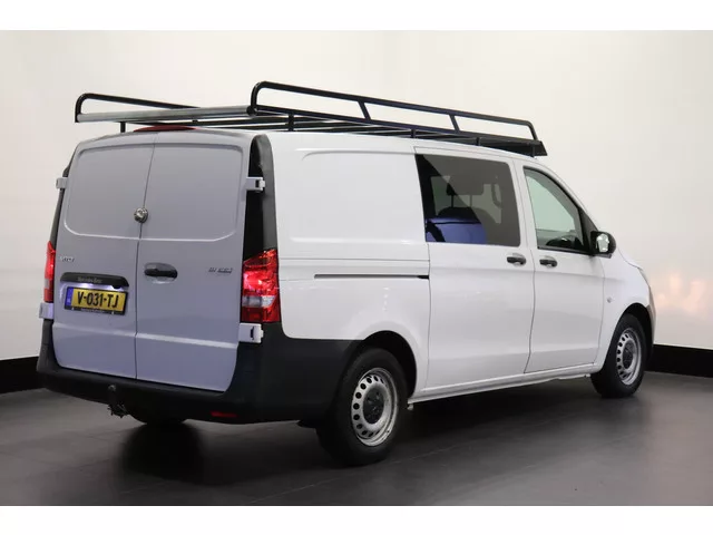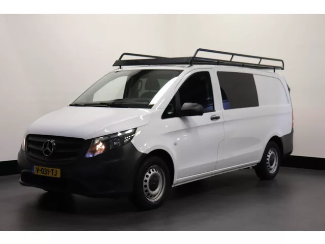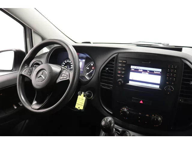 Mercedes-Benz Vito 111 CDI Lang Dubbele Cabine van het bouwjaar 2019. EURO 6, Milieuzone proof! Onder andere voorzien van Airco, Navigatiesysteem, Cruise control, Achteruitrijcamera met parkeersensoren voor en achter. Carrosserievorm: Bestelauto; 6 versn., Handgeschakeld; Modeljaar: 2016; 4WD; 85 kW; 270 Nm; 4 cilinders; 1.598cc; Gewicht: 1.970kg; Laadvermogen: 830kg; GVW: 2.800kg; L2H1; Wielbasis: 320cm; 72l tank; 0-100 km/h: 14,4s; Topsnelheid: 169km/u; Interieur: zwart, Stof; 5 zitplaatsen; 6,5 l/100km; 8 l/100km; 5,6 l/100km; 169 g/km CO₂; Euro 6; Aantal eigenaren: 5; APK: tot mrt. 2026; 3 sleutels (3 handzenders); Wegenbelasting: € 183p/kwrt; Informeer naar de financial lease-mogelijkheden; V-031-TJ