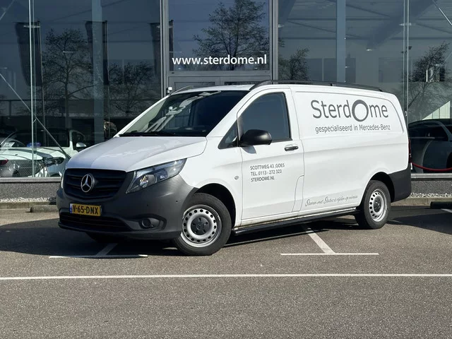 Sterke bedrijfswagen, Mercedes-Benz Vito 110 CDI Lang Handgeschakeld 6 Versnellingen. Demonstratie voertuig. Deze Vito is luxe uitgerust met o.a. Achterdeuren zonder ruit l MBUX l Camera l Tussenschot l Trekhaak l Betimmerd l Airconditioning l Tweezitsbank l Comfort stoel bestuurder l Parkeerpakket met PTS l Sidebars l. Carrosserievorm: Bestelauto; 6 versn., Handgeschakeld; Modeljaar: 2021; Voorwielaandrijving; 75 kW; 330 Nm; 4 cilinders; 1.950cc; Gewicht: 1.901kg; Laadvermogen: 899kg; GVW: 2.800kg; L2H1; Wielbasis: 320cm; 70l tank; Interieur: zwart, Stof; 3 zitplaatsen; 7,2 l/100km; 190 g/km CO₂; Euro 6; Dealer onderhouden (onderhoudsboekjes aanwezig); Eerste eigenaar; APK bij aflevering; 2 sleutels; Fabrieksgarantie tot: 17-05-2026; BOVAG Garantie (12 maanden); Wegenbelasting: € 174p/kwrt; vanaf € 559 p/m (informeer naar de mogelijkheden en voorwaarden); Optioneel afleverpakket: Afleveringspakket ZILVER Bedrijfswagen excl. BTW (€ 995 ex BTW); V-65-DNX