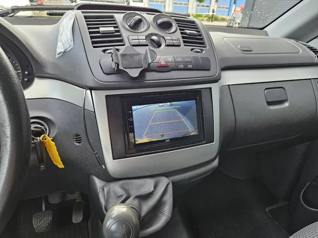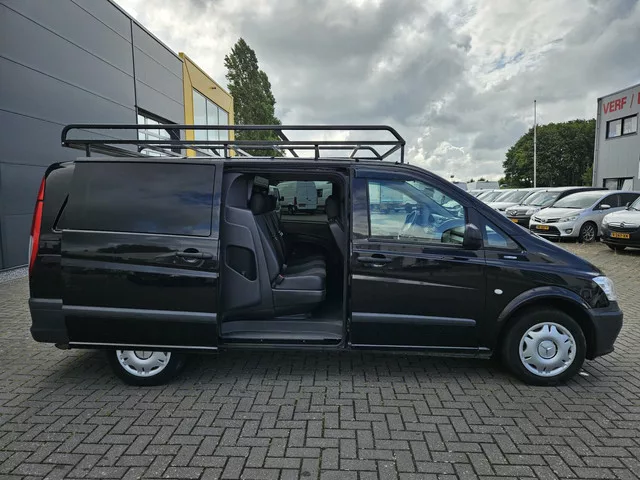Mercedes Vito 110 CDI Lang DC airco imperiaal lage km Euro 5. Voertuiginformatie: Kenteken: VJ-792-K; Merk: Mercedes; Model: Vito; APK tot: 20-03-2026; Tellerstand: 187724 KM; Carrosserievorm: Bestel; Aantal deuren: 4; Brandstofsoort: Diesel; Bouwjaar: 2014; Transmissie: Handgeschakeld; Kleur: zwart; Motorinhoud: 2143 cc; Aantal cilinders: 4; Motorcode: 651.940; Vermogen: 70 kW / 95pk; Ledig gewicht: 1919 kg; Max. trekgewicht: 2000 kg; Aantal zitplaatsen: 6; Verbruik: 7.4 l/100 km; BTW/Marge: BTW aftrekbaar, de prijs is exclusief BTW; Lengte: 501 cm; Breedte: 191 cm; Laadruimte hoogte: 141 cm; Aantal sleutels: 2; Motorrijtuigenbelasting: € 175 per kwartaal; Emissieklasse: Euro 5. Opties en accessoires: Pakket: Professional Line. Airco; Buitentemperatuurmeter; Warmtewerend glas. Exterieur. Achterklep; Centrale vergrendeling met afstandsbediening; Metaalkleur; Mistlampen voor; Trekhaak; Zijschuifdeur rechts. Infotainment. Radio CD speler. Interieur. Airco; Bestuurdersstoel in hoogte...