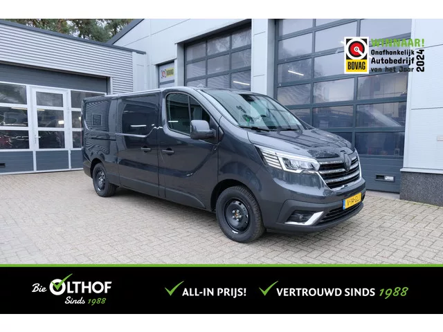 Betreft een nieuwe Renault Trafic lengte 2 met 131 pk, direct uit voorraad leverbaar! De kleur is donkergrijs en de bus heeft onder andere een achteruit rij camera, cruisecontrol, 4-seizoens banden etc. Wij hebben nog 2 van deze bussen op voorraad, op = op. De genoemde prijs is rijklaar, exclusief btw. Deze auto wordt standaard afgeleverd met ons all-in afleverpakket: - 6 maanden Bie Olthof garantie*; - Onderhoudsbeurt volgens fabrieksvoorschrift; - APK is minimaal 12 maanden geldig; - Complete poetsbeurt; - Minimaal een ¼ tank brandstof; - (Navigatie update niet inbegrepen); - (Elektrische of Hybride auto's worden met 1 laadkabel afgeleverd, tenzij er 2 laadkabels aanwezig zijn). Kortom; wegrijden zonder zorgen! *Geen 6 maanden Bie Olthof maar 12 maanden BOVAG garantie voor uw auto? Dit is bij ons mogelijk door het BOVAG garantie pakket af te nemen. Dit pakket is alleen van toepassing bij auto’s met een all-in pakket. Tegen een meerprijs van €500,- verlengen wij de Bie Olthof...