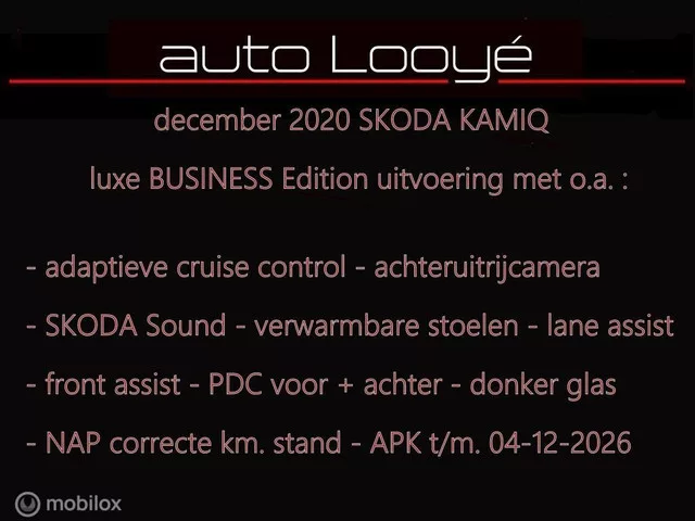 100 scherpe foto's op onze website ! Serieus correcte december 2020 SKODA KAMIQ 1.0 TSI DSG, in de luxe BUSINESS EDITION uitvoering, aangevuld met aangename fabrieksopties ! * incl. 12 mnd. Autotrust Uitgebreid garantie (t.w.v. 543 Euro). * bij ons nooit extra afleverkosten. * geen levertijd ; de auto staat 'ready to go !'. * laatst uitgevoerde onderhoud bij 100.068 km. De BUSINESS EDITION uitvoering houdt in (t.o.v. de Style versie) dat de auto onder andere extra is voorzien van : . - Bluetooth telefoonvoorbereiding. - phonebox met draadloos opladen (mits de telefoon qua formaat past). - DAB+ digitale radio. - Driver Activity Assistant, vermoeidheid waarschuwingssysteem. - full LED koplampen. - dynamische richtingaanwijzers. - mistlampen en bochtenverlichting. - LED verlichting in portieren, middenconsole, voetenruimte. - witte sfeerverlichting in dashboard. - middenarmsteun in achterbank rugleuning. - navigatiesysteem Amundsen met 9,2" kleuren touchscreen. - Apple CarPlay /...