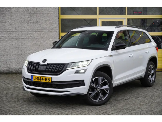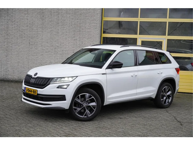 ŠKODA Kodiaq met de zeer luxe aanwezige opties als Lichtmetalen velgen | Led dagrijverlichting | Led koplampen | Led achterlichten | Led mistlampen | Parkeersensoren | Keyless entry | Elektrische trekhaak | Elektrische achterklep | Achteruitrijcamera | App-Connect | Dashboard verlichting | Navigatiesysteem | Virtual cockpit | Canton Audio Systeem | Climate control | Cruise control | Elektrische bestuurderstoel met geheugen | Sportstoelen | Sportline stuurwiel | Verwarmde voorstoelen | Zwarte hemel | Extra getint glas. 6 versn., Handgeschakeld; Modeljaar: 2019; 4WD; 110 kW; 250 Nm; 4 cilinders; 1.498cc; Gewicht: 1.449kg; Laadvermogen: 708kg; GVW: 2.157kg; Max. trekgewicht: 1.800kg; LxBxH: 480x188x169cm; Wielbasis: 279cm; 58l tank; 0-100 km/h: 9,8s; Topsnelheid: 200km/u; Interieur: zwart, Leder/alcantara; 5 zitplaatsen; 5,8 l/100km; 7,2 l/100km; 5 l/100km; 170 g/km CO₂; Energielabel B; Euro 6; Dealer onderhouden (onderhoudsboekjes aanwezig); Aantal eigenaren: 3; APK bij aflevering;...