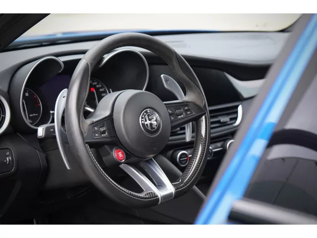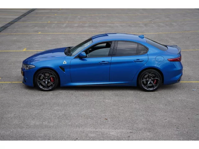 Een Giulia Quadrifoglio uit 2019, en wat voor één... Maar heel zelden komen ze voor in Blu Misano. En dan ook nog eens met maar 38.000km gereden en in waanzinnig mooie staat. Op en top verzorgd zowel van binnen als van buiten. Uitgerust met de mooie Classico velgen, rode remmen, het carbon leder alcantara stuurwiel en zwarte stiksels in het intererieur. Daarnaast ook nog voorzien van privacy glass en het brede 8,8 inch infotainment systeem. Volledig inzichtelijk onderhouden en zowel van binnen als van buiten als nieuw. Kijk voor meer dan 35 foto's in hoge resolutie op www.samvandalen.com. 8 versn., Automaat; Achterwielaandrijving; 375 kW; 6 cilinders; 2.891cc; Gewicht: 1.595kg; Laadvermogen: 555kg; GVW: 2.150kg; Wielbasis: 282cm; 0-100 km/h: 3,9s; Topsnelheid: 307km/u; Interieurkleur: Zwart; 5 zitplaatsen; 9,2 l/100km; 206 g/km CO₂; Energielabel G; Euro 6; Dealer onderhouden (onderhoudsboekjes aanwezig); APK bij aflevering; Schadevrij; 2 sleutels (2 handzenders); Wegenbelasting:...