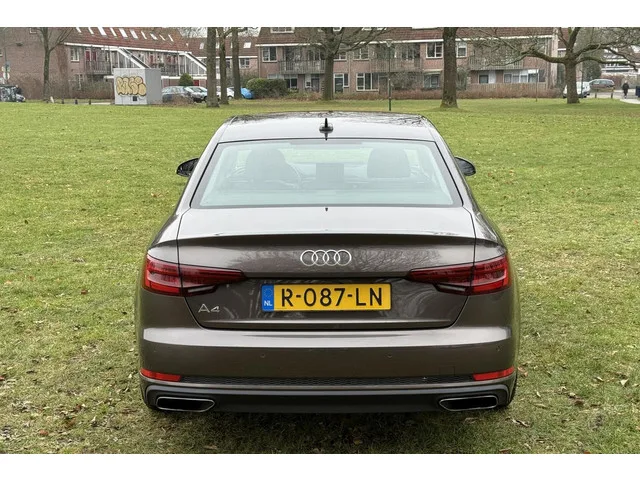 Audi A4 Limousine 1.4 TFSI 150pk DSG 1e Eigenaar Sport-leder. Kenteken: R-087-LN; Merk: Audi; Model: A4 Limousine; APK tot: 21-09-2026; Tellerstand: 102559 KM; Carrosserievorm: Sedan; Aantal deuren: 4; Brandstofsoort: Benzine; Bouwjaar: 2019; Transmissie: Automaat S-tronic 7-traps; Kleur: bruin Metallic; Kleurnaam: Argusbruin metallic; Bekleding: Leder; Kleur interieur: zwart; Interieurnaam: Sport stoelen Zwart/Titanium grau; Motorinhoud: 1395 cc; Aantal cilinders: 4; Vermogen: 110 kW / 150pk; Ledig gewicht: 1480 kg; Max. massa voertuig: 1945 kg; Aantal zitplaatsen: 5; Verbruik: 5.7 l/100 km; BTW/Marge: Marge, de BTW is niet aftrekbaar; Lengte: 473 cm; Breedte: 184 cm; Hoogte: 142 cm; Aantal sleutels: 2; Onderhoudshistorie aanwezig: Dealer onderhouden; Motorrijtuigenbelasting: € 243 - 268 per kwartaal; Emissieklasse: Euro 6; Bandenmaat voor: 225/50/17; Bandemaat achter: 225/50/17; Velgmaat: 17 inch; Wielbasis: 2820 mm. Comfort. Boordcomputer; Cruise control; Regensensor. Exterieur. ...