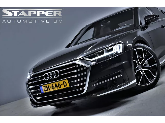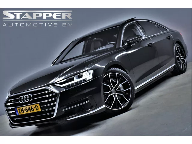 Deze prachtige Audi A8 55 TFSI verkeert zowel technisch als cosmetisch werkelijk in topconditie en is in het echt nét zo mooi als op de foto's. De auto is bij binnenkomst voorzien van een zo goed als nieuwe motor met 17.000km (aantoonbaar) t.w.v. €15.129,-. De prijs is inclusief garantie en afleveren, er komt dus niets bij, hij staat helemaal rijklaar in onze showroom en u kunt 'm direct meenemen. Kortom: u komt niet voor niets! 8 versn., Automaat; Modelreeks: okt. 2017 - mei 2018; 4WD; 250 kW; 500 Nm; 6 cilinders; 2.995cc; Gewicht: 1.895kg; Laadvermogen: 785kg; GVW: 2.680kg; Max. trekgewicht: 2.300kg; LxBxH: 529x195x150cm; Wielbasis: 300cm; 72l tank; 0-100 km/h: 5,6s; Topsnelheid: 250km/u; Interieurkleur: Zwart; 5 zitplaatsen; 7,7 l/100km; 10,3 l/100km; 6,2 l/100km; 175 g/km CO₂; Energielabel C; Euro 6; Aantal eigenaren: 5; APK: tot mrt. 2026; 2 sleutels (2 handzenders); Wegenbelasting: € 347-€ 383p/kwrt; Fabrikant: Stapper Automotive B.V. Constructiestraat 9 4143HX LEERDAM, NL...
