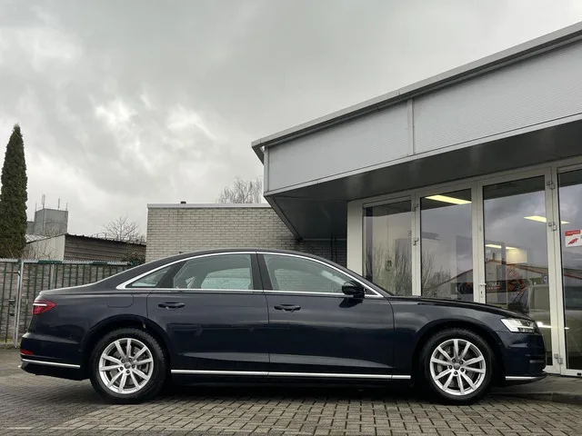 Audi A8 55 TFSI QUATTRO 340PK Voorzien van oa: 4-wielsturing, Head-up, B&O, acc enz Origineel NL geleverd! Audi A8 55 TFSI QUATTRO 4-WIEL STURING+ACC+NACHTZICHT+B&O. Kenteken: SL-630-N; Merk: Audi; Model: A8; APK tot: 03-05-2026; Tellerstand: 146815 KM; Carrosserievorm: Sedan; Aantal deuren: 4; Brandstofsoort: Benzine; Bouwjaar: 2018; Transmissie: Automaat; Kleur: blauw; Kleurnaam: Moonlight blauw metallic; Bekleding: Leder; Kleur interieur: beige; Interieurnaam: Saiga beige leder; Motorinhoud: 2995 cc; Aantal cilinders: 6; Motorcode: CZS; Vermogen: 250 kW / 341pk; Ledig gewicht: 1895 kg; Max. trekgewicht: 2300 kg; Aantal zitplaatsen: 5; Verbruik: 7.9 l/100 km; BTW/Marge: Marge, de BTW is niet aftrekbaar; Lengte: 517 cm; Breedte: 195 cm; Aantal sleutels: 2; Onderhoudshistorie aanwezig: Dealer onderhouden; Motorrijtuigenbelasting: € 360 - 394 per kwartaal; Emissieklasse: Euro 6. Comfort. Regensensor. Exterieur. Adaptief demping systeem; Buitenspiegel(s) automatisch dimmend...