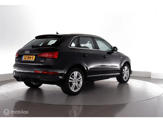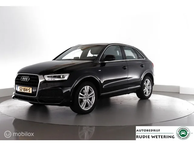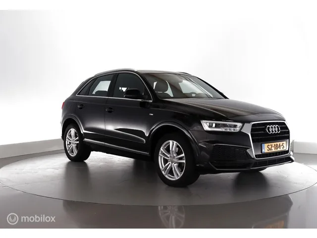 Audi Q3 1.4 TFSI 150PK Automaat S-line Sport Advance Sport trekhaak|stoelverw.|pdc|lmv18. Kenteken: SZ-184-S; Merk: Audi; Model: Q3; APK tot: 29-06-2026; Tellerstand: 56508 KM; Carrosserievorm: SUV; Aantal deuren: 5; Brandstofsoort: Benzine; Bouwjaar: 2018; Transmissie: Automaat 6-Traps; Kleur: zwart Metallic; Kleurnaam: Mythosschwartz Metallic Kleurcode: LY9T; Bekleding: Leder/Stof; Kleur interieur: zwart; Interieurnaam: S-line; Motorinhoud: 1395 cc; Aantal cilinders: 4; Motorcode: CZE; Vermogen: 110 kW / 150pk; Ledig gewicht: 1380 kg; Max. trekgewicht: 1800 kg; Aantal zitplaatsen: 5; Verbruik: 5.9 l/100 km; BTW/Marge: Marge, de BTW is niet aftrekbaar; Lengte: 439 cm; Breedte: 183 cm; Aantal sleutels: 2; Onderhoudshistorie aanwezig: Ja; Motorrijtuigenbelasting: € 226 - 247 per kwartaal; Emissieklasse: Euro 6; Bandenmaat voor: 235/50/18; Bandemaat achter: 235/50/18; Wielbasis: 2600 mm. Comfort. Boordcomputer; Cruise control; Regensensor. Exterieur. Achterruitwisser; Aluminium delen...