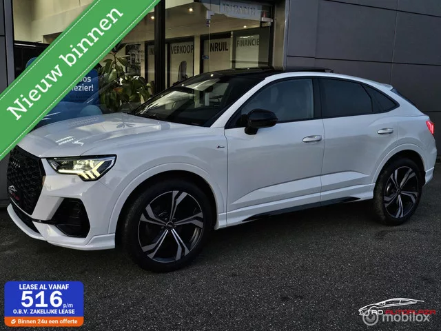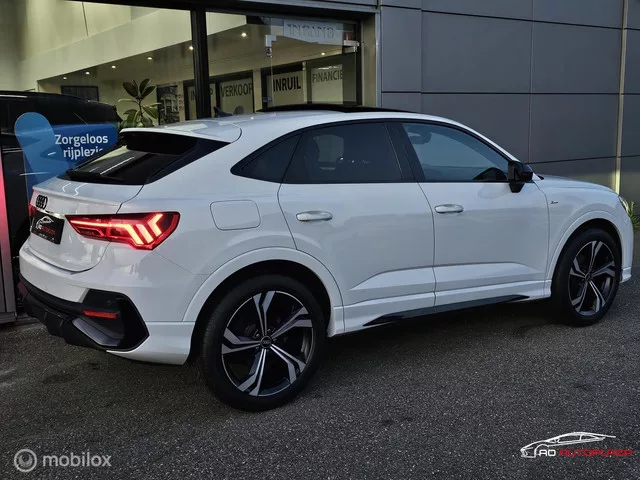 Audi Q3 Sportback 35 TFSI S Edition Panorama/360° camera/20"/3x S-line. Merk: Audi; Model: Q3 Sportback; APK tot: 29-07-2026; Tellerstand: 49508 KM; Carrosserievorm: SUV; Aantal deuren: 5; Brandstofsoort: Benzine; Bouwjaar: 2020; Transmissie: Automaat; Kleur: wit; Bekleding: Leder; Kleur interieur: zwart; Motorinhoud: 1498 cc; Aantal cilinders: 4; Vermogen: 110 kW / 150pk; Ledig gewicht: 1505 kg; Aantal zitplaatsen: 5; Verbruik: 6.5 l/100 km; BTW/Marge: BTW aftrekbaar, de prijs is inclusief BTW; Aantal sleutels: 2; Onderhoudshistorie aanwezig: Dealer onderhouden. Pakket: Parkeer pakket. Parkeersensor voor. Comfort. Cruise control; Regensensor. Exterieur. Achterruitwisser; Adaptief demping systeem; Aluminium delen exterieur; Buitenspieg.elektr.inklap en aut. dim; Buitenspiegels elektrisch verstel- en verwarmbaar; Buitenspiegels in carrosseriekleur; Centrale vergrendeling met afstandsbediening; Dimlichten automatisch; Elektrisch bedienbare achterklep; Elektrisch glazen schuifdak...