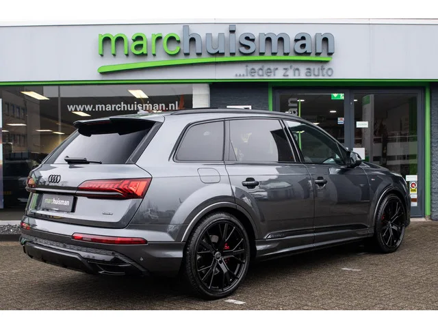 Prachtige Audi Q7 60 TFSI e quattro geheel S-Line uitgevoerd. In Daytonagrijs pareleffect i.c.m. zwart half lederen / alcantara bekleding. Uitgerust met veel (gewilde) opties zoals elektrisch bedienbaar glazen panoramadak, in rood uitgevoerde remklauwen, 22 inch SQ7 licht metalen velgen in glanzend zwart, head-up display, stoelverwarming voor en achter, Optiek pakket zwart, Audi Advanced Key (keyless entry), BOSE Soundsystem, interieurvoorverwarming, adaptieve cruise control, Audi Side Assist, elektrisch inklapbare trekhaak, etc. BTW-auto (BTW aftrekbaar voor ondernemers). Voorzien van veel fabrieksopties zoals: Trekhaak (kogelkop elektrisch zwenkbaar) 1D3. Diefstalbeveiliging voor Wielen (Velgsloten) 1PR. Sperdifferentieel 1Y6. Stuur (Sport/leder - 3-spaaks, afgeplat aan de onderzijde) met Multifunctie en Schakelfunctie 2PF. Panoramadak voor elektrisch, achter vast 3FU. Isofix-houder voor Kinderzitje aan Passagiersstoel 3G4. Stoelen voor electr. verstelbaar (links met Memory) 3L4...