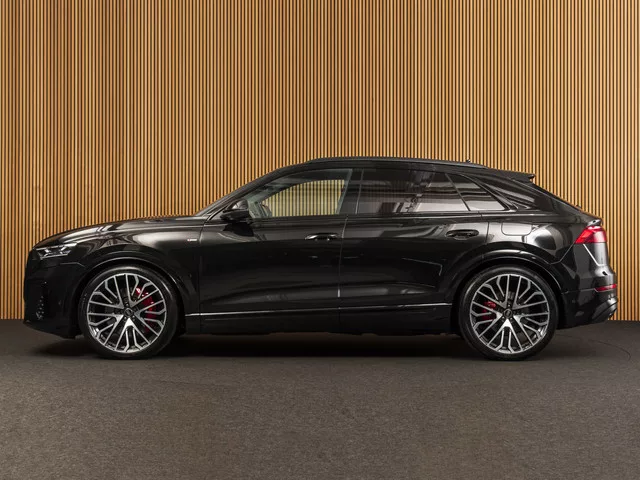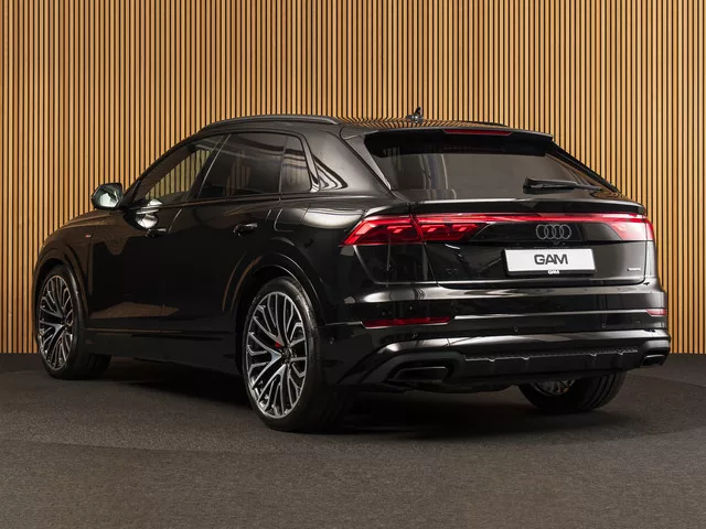 Audi Q8 60 TFSI e quattro. Car No: 2732. - Prijs inclusief nieuw Nederlands kenteken. - BTW auto. - Europese fabrieksgarantie tot 08-2030 of 100.000km. - Inruil mogelijk. Uitgevoerd in Myhtos zwart metallic (0E) met zwart leder (UB). Voorzien van: 04H - S-Line. 0N5 - Vierwielbesturing. 1D3 - Trekhaak. 1G8 - Bandenreparatieset. 1XP - Lederen multifunctioneel stuurwiel, 3-spaaks, met schakelpaddles en stuurverwarming. 2C7 - Elektrische stuurkolomverstelling. 2F1 - Audi connect sleutel. 2H9 - Audi drive select. 2MA - Adaptieve luchtvering sport. 3FU - Panoramadak. 3G4 - ISOFIX kinderzitbevestiging voor de passagiersstoel. 3NS - Achterbank plus. 3S2 - Zwarte dakrails. 4A4 - Stoelverwarming voor en achter. 4D8 - Stoelventilatie en massagefunctie voor. 4E7 - Elektrisch bedienbare achterklep. 4GF - Warmtewerend glas voorruit. 4UF - Frontairbags, passagiersairbag uitschakelbaar. 4ZP - Optiekpakket zwart plus. 5MI - Decoratielijsten in mat geborsteld aluminium met lineaire zilverafdruk. 60I...
