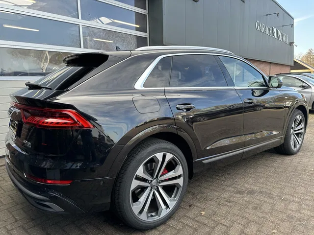 Audi Q8 50 3.0 TDI QUATTRO S-LINE NL AUTO/3500KG TH *ALL-IN PRIJS*. Kenteken: TJ-995-R; Merk: Audi; Model: Q8; APK tot: 30-08-2026; Tellerstand: 103430 KM; Carrosserievorm: SUV; Aantal deuren: 5; Brandstofsoort: Diesel; Bouwjaar: 2018; Transmissie: Automaat; Kleur: zwart Metallic; Bekleding: Leder; Kleur interieur: zwart; Motorinhoud: 2967 cc; Aantal cilinders: 6; Motorcode: DHX; Vermogen: 210 kW / 286pk; Ledig gewicht: 2130 kg; Max. trekgewicht: 3500 kg; Aantal zitplaatsen: 5; Verbruik: 6.8 l/100 km; BTW/Marge: Marge, de BTW is niet aftrekbaar; Lengte: 499 cm; Breedte: 200 cm; Aantal sleutels: 2; Onderhoudshistorie aanwezig: Ja; Motorrijtuigenbelasting: +/- € 766 kwartaal; Emissieklasse: Euro 6. Comfort. Regensensor. Exterieur. Adaptief demping systeem; Aluminium delen exterieur; Buitenspiegel(s) automatisch dimmend; Buitenspiegels elektrisch inklapbaar; Buitenspiegels elektrisch verstel- en verwarmbaar; Buitenspiegels in carrosseriekleur; Centrale vergrendeling met...