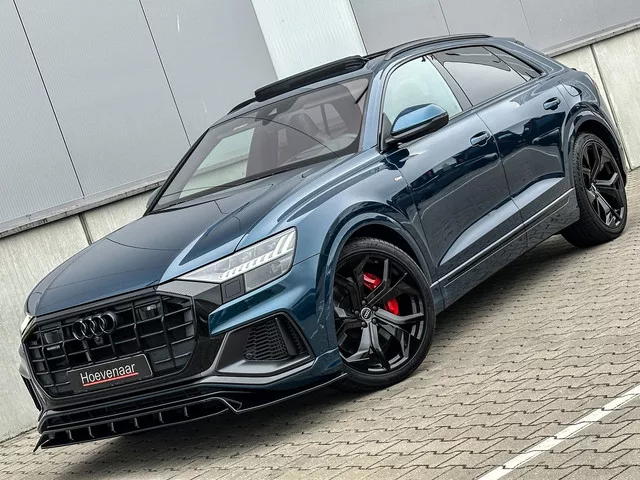 Audi Q8 55tfise Hybrid, in de prachtige kleur galaxy blauw en Werkelijk afgeladen vol kwa opties. Bijzonderheden en optie: 22 inch nieuwe SQ8 velgen met banden. Zonwerend voorraam. SQ8 diffuser uitlaat. Softclose. Gelaagd glas. 360Graden camera met topview. Rode s-line remklauwen. Elektrische trekhaak. Luchtvering. Verwarmd stuur. Adaptieve cruise controle. B&O geluid installatie. Rs- stoelen. Head up display. Dodehoek assistent. Automatisch inparkeren. Rs-spoiler dak. Front lip spoiler. Stand kachel. Black optic. Zwarte logo´s. Privacy glas. Elektrische kofferklep met voetsensor. Keyless go. Key less entry. Kofferbak rolhoes. Led koplampen en achterlichten. Matrix achterlichten. Garage en poort opener. Elektrische verstelbare stoelen met memory. Stoel verwarming. Stoel koeling. Stoel massage. Gescheiden klimaat controle. Sfeerverlichting meerkleuren. Hoogglans zwarte afwerking. Virtual cockpit. Car play. Kachel achterin bedienbaar. Stoelverwaming achter. Panorama dak. Drive select...