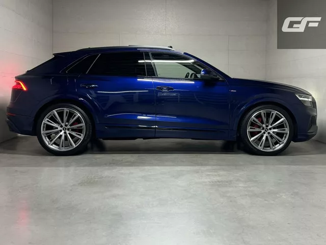 Audi Q8 55 TFSI Quattro S-Line Black Edition Pano B&O 360° Sfeer Luchtv. Trekh. Kenteken: JTP-98-X; Merk: Audi; Model: Q8; APK tot: 07-01-2028; Tellerstand: 70833 KM; Carrosserievorm: SUV; Aantal deuren: 5; Brandstofsoort: Benzine; Bouwjaar: 2022; Transmissie: Automaat; Kleur: blauw; Kleurnaam: Navarra Blue Metallic; Bekleding: Leder/Alcantara; Kleur interieur: zwart; Motorinhoud: 2995 cc; Aantal cilinders: 6; Vermogen: 250 kW / 341pk; Ledig gewicht: 2080 kg; Aantal zitplaatsen: 5; Verbruik: 10.7 l/100 km; BTW/Marge: Marge, de BTW is niet aftrekbaar; Aantal sleutels: 2; Onderhoudshistorie aanwezig: Dealer onderhouden. Pakket: Assistentie pakket Parking. Parkeer assistent; Rondomzicht camera. Pakket: City pakket. Achteruitrij assistent; Dodehoek detectie; Kruisend verkeer detectie. Pakket: Optie pakket. DAB; TV-ontvanger. Pakket: Keyless pakket. Elektrisch bedienbare achterklep met sensorsturing; Keyless entry; Keyless start. Pakket: Tour pakket. Cruise control adaptief met Stop&Go...