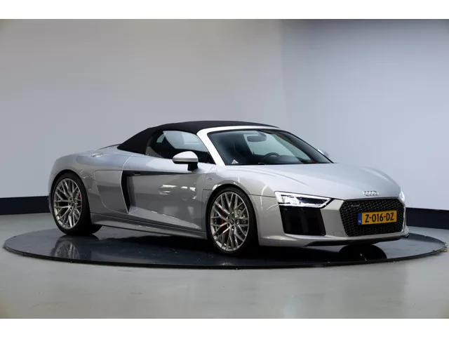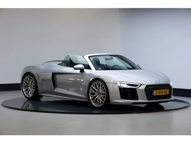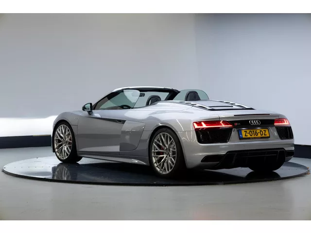 Zeer chique uitgevoerde R8 Spyder in het Floretzilver met Floretzilveren sideblades. De voorspoiler en diffuser achter zijn in het glanzend carbon uitgevoerd. In het interieur vinden we het uitgebreide lederpakket met crescendorood stiksel. De Volledige optie lijst is als volgt:  . 0P8 - Sportuitlaatsysteem. 2MN - Audi Magnetic Ride. 1N8 - Dynamic steering. 40G - Velgen, gesmeed lichtmetaal 8,5J x 20 voor, 11J x 20 achter, "10-spaak-Y"-design. PC2 - Remzadels hoogglanzend rood gespoten. 5L4 - Exterieurpakket in Carbon glanzend. 6H7 - Sideblade kleur naar klantwens. PXF - LED-koplampen met Audi Laserlicht. 8SP - Dynamische richtingaanwijzers achter. 8G1 - Grootlichtassistent. 7M9 - Instaplijsten met verlichte aluminium inleg. 5MA - Inleg, eloxallak antraciet. 2FJ - R8 performance stuurwiel, multifunctioneel, driespaaks afgevlakt. Q1D - R8-sportstoelen. 3PR - Stoelen, 18 voudig elektrisch en pneumatisch verstelbaar met geheugenfunctie voor de bestuurdersstoel. 4A3 - Stoelverwarming...