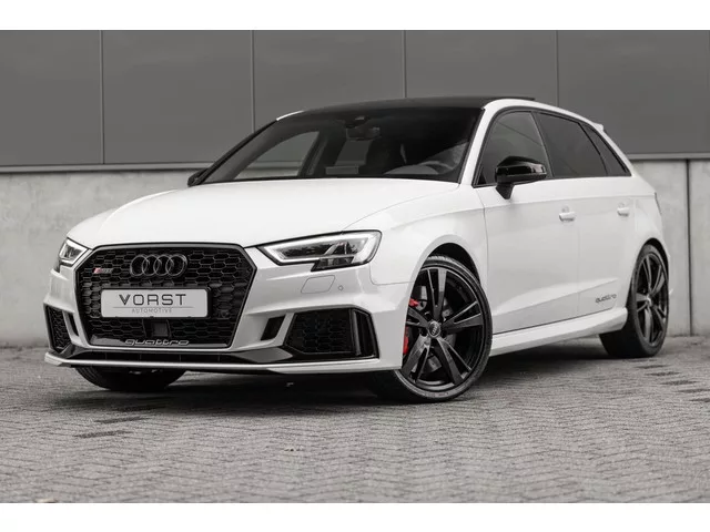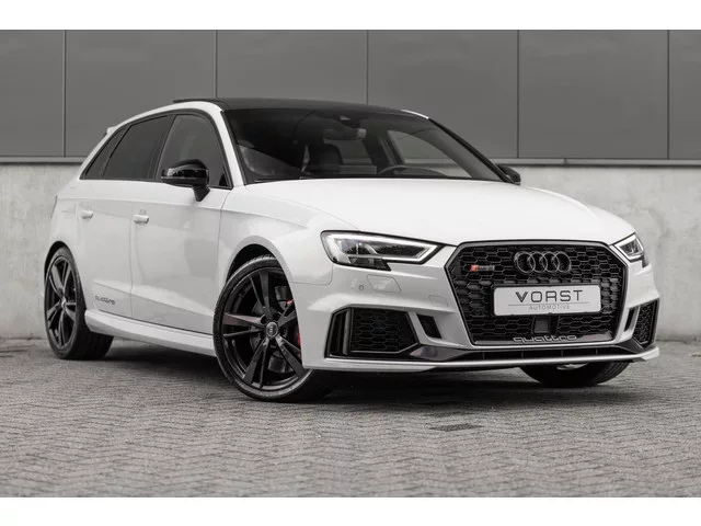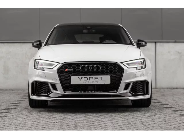 Audi RS3 2.5 TFSI quattro B&O Keyless Pano Schaalstoel ACC. Kenteken: N-107-ZG; Merk: Audi; Model: RS3; APK tot: 31-01-2027; Tellerstand: 146386 KM; Carrosserievorm: Hatchback; Aantal deuren: 5; Brandstofsoort: Benzine; Bouwjaar: 2018; Transmissie: Automaat; Kleur: wit; Motorinhoud: 2480 cc; Aantal cilinders: 5; Motorcode: DAZ; Vermogen: 294 kW / 400pk; Ledig gewicht: 1485 kg; Aantal zitplaatsen: 5; Verbruik: 8.4 l/100 km; BTW/Marge: Marge, de BTW is niet aftrekbaar; Lengte: 434 cm; Breedte: 180 cm; Motorrijtuigenbelasting: € 241 - 264 per kwartaal; Emissieklasse: Euro 6. Pakket: Assistance pakket. Dodehoek detectie; Rijstrooksensor met correctie. Pakket: Comfort pakket. Binnenspiegel automatisch dimmend; Buitenspiegel(s) automatisch dimmend; Buitenspiegels elektrisch inklapbaar; Lendesteun(en) verstelbaar; Voorstoelen verwarmd. Pakket: Assistentie Pakket. Cruise control adaptief met Stop&Go; File assistent; Grootlichtassistent; Parkeersensor voor en achter; Rijstrooksensor met...