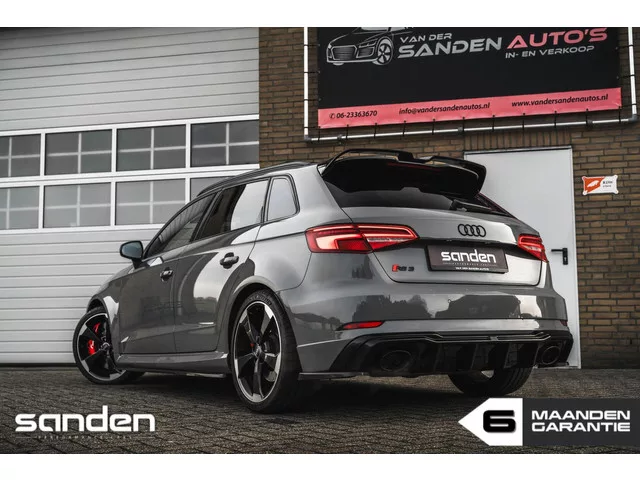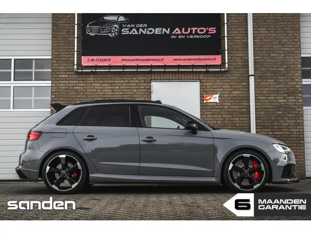 Unieke Audi RS3 2.5 TFSI quattro in Nardo Grey|JD Engineering 535pk|RacingLine BigBrakeKit|Panoramadak|B&O|AdaptiveCruise|RS seats. Audi RS3 2.5 TFSI quattro|Pano|78dkm|RS seats|RacingLine|B&O. Kenteken: K-969-GX; Merk: Audi; Model: RS3; APK tot: 26-04-2027; Tellerstand: 78250 KM; Carrosserievorm: Hatchback; Aantal deuren: 5; Brandstofsoort: Benzine; Bouwjaar: 2019; Transmissie: Automaat; Kleur: grijs; Kleurnaam: Nardo Grey; Bekleding: Leder; Kleur interieur: zwart; Interieurnaam: RS-Stoelen met rode stiksels; Motorinhoud: 2480 cc; Aantal cilinders: 5; Motorcode: DNW; Vermogen: 294 kW / 400pk; Ledig gewicht: 1505 kg; Aantal zitplaatsen: 5; Verbruik: 5.5 l/100 km; BTW/Marge: Marge, de BTW is niet aftrekbaar; Lengte: 434 cm; Breedte: 180 cm; Aantal sleutels: 2; Onderhoudshistorie aanwezig: Dealer onderhouden; Motorrijtuigenbelasting: € 253 - 276 per kwartaal; Emissieklasse: Euro 6; Velgmaat: 19 inch. Pakket: Assistentie Pakket. Cruise control adaptief met Stop&Go; File assistent...