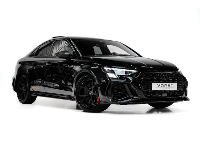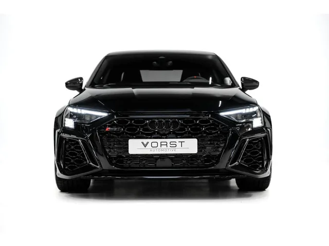 Audi RS 3 2.5 TFSI quattro Pano B&O Keramisch Leer Carbon. Kenteken: JDF-18-V; Merk: Audi; Model: RS 3; APK tot: 31-07-2027; Tellerstand: 51135 KM; Carrosserievorm: Sedan; Aantal deuren: 4; Brandstofsoort: Benzine; Bouwjaar: 2022; Transmissie: Automaat; Kleur: zwart; Bekleding: Leder; Kleur interieur: zwart; Motorinhoud: 2480 cc; Aantal cilinders: 5; Motorcode: DNW; Vermogen: 294 kW / 400pk; Ledig gewicht: 1550 kg; Aantal zitplaatsen: 5; Verbruik: 8.2 l/100 km; BTW/Marge: Marge, de BTW is niet aftrekbaar; Lengte: 454 cm; Breedte: 185 cm; Aantal sleutels: 2; Onderhoudshistorie aanwezig: Dealer onderhouden; Motorrijtuigenbelasting: € 253 - 276 per kwartaal; Emissieklasse: Euro 6. Pakket: LED lichtpakket. Matrix LED koplampen. Pakket: RS dynamic pakket. Adaptief demping systeem; Keramische remschijven. Comfort. Cruise control; Regensensor. Exterieur. Achterspoiler; Adaptief demping systeem; Aluminium delen exterieur; Buitensp.elektr.inklap en aut. dimmend; Buitenspiegels elektrisch...