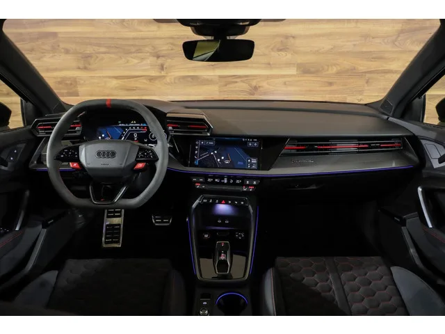 Audi RS 3 2.5 TFSI Quattro|Carbon RS Seats|Pano|ACC|HUD|Camera|. Audi RS 3 2.5 TFSI Quattro|Carbon RS Seats|Pano|ACC|HUD|Camera|. Merk: Audi; Model: RS 3; Tellerstand: 5038 KM; Carrosserievorm: Hatchback; Aantal deuren: 5; Brandstofsoort: Benzine; Bouwjaar: 2025; Transmissie: Automaat; Kleur: zwart; Kleurnaam: Mythos black metallic; Bekleding: Alcantara; Kleur interieur: zwart; Interieurnaam: Honeycomb Pattern Carbon RS Seats; Motorinhoud: 2480 cc; Aantal cilinders: 5; Vermogen: 294 kW / 400pk; Ledig gewicht: 1540 kg; Aantal zitplaatsen: 5; Verbruik: 9.3 l/100 km; BTW/Marge: Marge, de BTW is niet aftrekbaar; Aantal sleutels: 2; Onderhoudshistorie aanwezig: Dealer onderhouden. Pakket: Assistentie Pakket. Achteruitrij assistent; Actieve noodgeval assistent; Bots herkenning en activatie; Cruise control adaptief met Stop&Go; Dodehoek detectie; Rijstrooksensor met correctie; Uitstap waarschuwing. Pakket: LED lichtpakket. Matrix LED koplampen. Pakket: Navigatie pakket. Audio installatie...