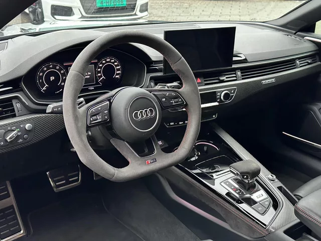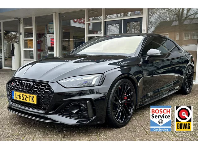 Audi RS 5 2.9 TFSI RS 5 Quattro Full Carbon, Leer, Keramisch, B&O.. Kenteken: L-652-TK; Merk: Audi; Model: RS 5; APK tot: 03-10-2026; Tellerstand: 65089 KM; Carrosserievorm: Coupé; Aantal deuren: 2; Brandstofsoort: Benzine; Bouwjaar: 2020; Transmissie: Automaat; Kleur: zwart Metallic; Motorinhoud: 2894 cc; Aantal cilinders: 6; Motorcode: DEC; Vermogen: 331 kW / 451pk; Ledig gewicht: 1660 kg; Aantal zitplaatsen: 4; Verbruik: 9.4 l/100 km; BTW/Marge: Marge, de BTW is niet aftrekbaar; Lengte: 472 cm; Breedte: 187 cm; Onderhoudshistorie aanwezig: Ja; Motorrijtuigenbelasting: € 307 - 335 per kwartaal; Emissieklasse: Euro 6. Pakket: Exclusive pakket. Carbon exterieur delen; Microvezel interieurdelen; Zwarte (glans) exterieur delen. Comfort. Boordcomputer; Cruise control. Exterieur. Buitenspiegels elektrisch verstel- en verwarmbaar; Buitenspiegels in carrosseriekleur; Centrale vergrendeling met afstandsbediening; Getint glas; Keramische remschijven; Koplampen adaptief; Koplampreiniging...