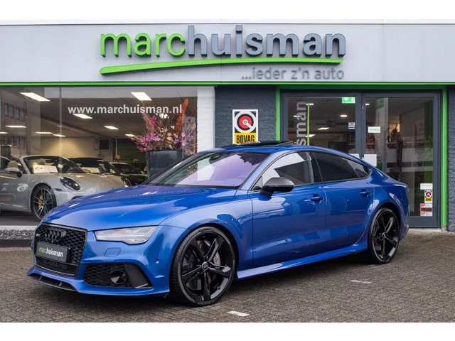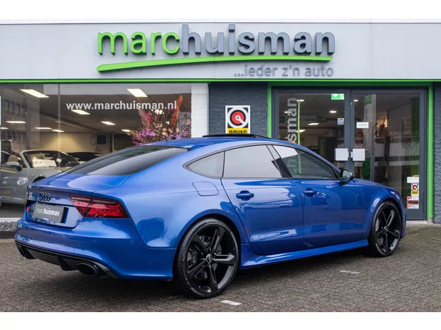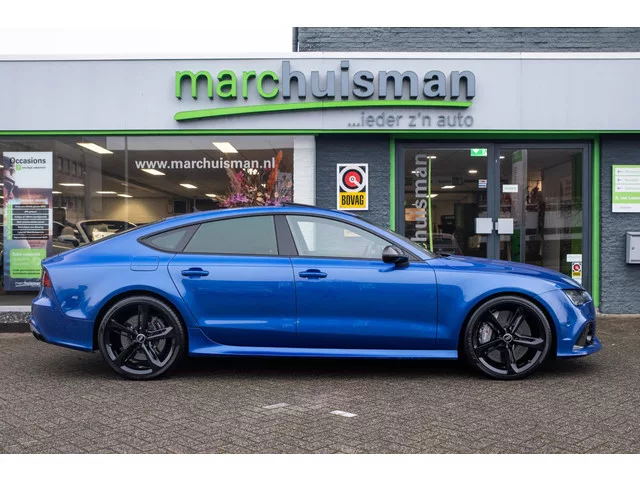 Werkelijk een uniek exemplaar. Deze bijzondere en schitterende Audi RS7 Sportback in een zeer unieke samenstelling! Voorzien van zo goed als alle fabrieksopties! In Sepang blauw i.c.m. een volledig Audi Exclusive lederen interieur (Bruin lederen bekleding met honingraatpatroon), dashboard volledig in leder uitgevoerd en voorzien van alcantara hemelbekleding. Verder uitgerust met Dynamic Plus pakket (o.a. keramische remmen) en Bang & Olufsen Advanced audiosysteem. Afkomstig van de 2e eigenaar (een echte liefhebber; wij kochten deze auto voor de vorige eigenaar van een Duitse Audi dealer in 2022). Voorzien van veel fabrieksopties zoals: Sport-uitlaatsysteem 0P6. Sport-chassis S / RS specifiek 2MC. Schuif-/hefdak electr. (Glas) met Voorselectie-automaat 3FE. Doorlaadopening met Skizak 3X2. Zonnescherm aan Achterruit 3Y6. Stoelverwarming voor en achter 4A4. Zij-airbag achter 4X4. Optiek-pakket Zwart 4ZD. Interieurinrichting: Decordelen Aluminium / Hout Beaufort, zwart 5TB. Buitenspiegel...