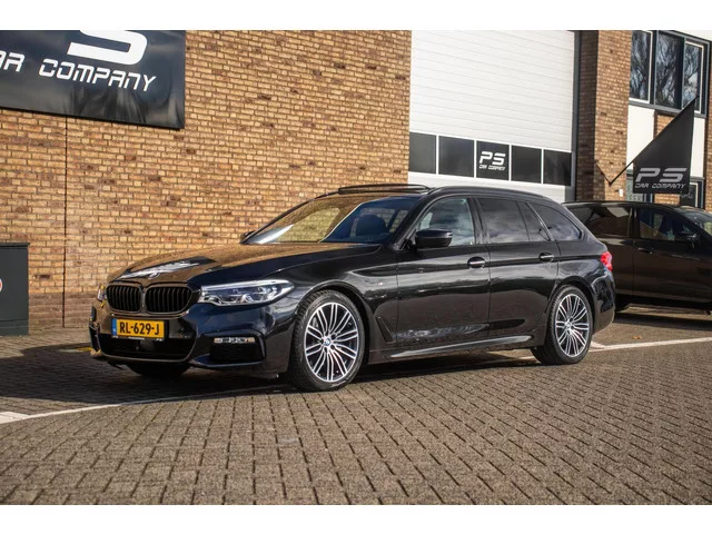 BMW 5-serie Touring 520i M-Sport, NAP, Leder, Pano, HUD, H&K Sound, Carplay, Adaptive Cruise, Isofix, elek. stoelen verwarmd, 19''. BMW 5-serie Touring 520i M-Sport, NAP, Leder, Pano, H&K, ACC. Kenteken: RL-629-J; Merk: BMW; Model: 5-serie Touring; APK tot: 21-10-2026; Tellerstand: 73746 KM; Carrosserievorm: Station; Aantal deuren: 5; Brandstofsoort: Benzine; Bouwjaar: 2018; Transmissie: Automaat; Kleur: zwart; Bekleding: Leder; Kleur interieur: zwart; Motorinhoud: 1998 cc; Aantal cilinders: 4; Motorcode: B48B20A; Vermogen: 135 kW / 184pk; Ledig gewicht: 1605 kg; Max. trekgewicht: 2000 kg; Aantal zitplaatsen: 5; Verbruik: 5.9 l/100 km; BTW/Marge: Marge, de BTW is niet aftrekbaar; Lengte: 494 cm; Breedte: 187 cm; Hoogte: 1498 cm; Aantal sleutels: 2; Onderhoudshistorie aanwezig: Ja; Motorrijtuigenbelasting: € 269 - 297 per kwartaal; Emissieklasse: Euro 6; Bandenmaat voor: 245/40/19; Bandemaat achter: 275/35/19. Comfort. Boordcomputer; Regensensor. Exterieur. Achterruit apart te openen...