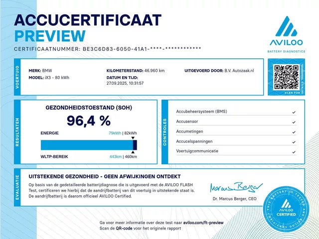 Rijklaarprijs incl. BTW. BMW iX3 High Executive in Phytonicblau metallic in combinatie met Leder ‘Vernasca’ Cognac. Zeer compleet uitgevoerd, BMW dealeronderhouden. Aviloo accuconditie (SoH): 96,4%. Actieradius (WLTP): 460 km. Uitrusting / BMW configuratie. C1M  -  Phytonicblau metallic lak. 7EZ  -  BMW High Executive. MAPQ  -  Leder ‘Vernasca’ Cognac met decoratief stiksel. 1VE  -  20 inch lichtmetalen wielen met aerodynamisch design (styling 843) in Bicolor Jet Black. 223  -  Adaptief onderstel. 322  -  Comfort Access. 3KA  -  Geluidsdempende zijruiten in de voorportieren. 481  -  Sportstoelen voor. 459  -  Elektrisch verstelbare voorstoelen.     incl. bestuurdersstoel met geheugen voor 2 posities. 488  -  Elektrisch verstelbare lendensteunen op voorstoelen. 4V1  -  BMW IconicSounds Electric. 552  -  Adaptieve LED koplampen. 5AU  -  Driving Assistant Profession.     Active Cruise Control.     Steering and Lane Control Assistant.     Lane Departure Warning.     Lane Change Warning...