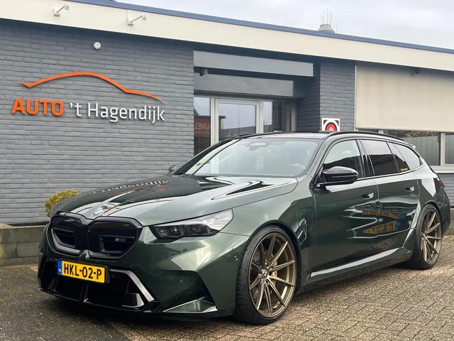 Staat op nieuwe (vanaf 14.500km) set 22" matbronzen velgen met nieuwe Continental zomerbanden! Prachtige origineel Nederlandse BMW M5 Touring in speciaal bestelde kleur Malachite groen metallic. Voorzien van Gyeon glascoating en Eibach verlagingsveren. Deze M5 beschikt over 3 jaar fabrieksgarantie vanaf nieuw, dus tot 05-04-2028! Dit is nog te verlengen tot 04-2030! Dit betreft onze privé-auto, derhalve bellen voor beschikbaarheid op locatie en de km's lopen heel licht op (stand 25-2 15.660km). Prijs inclusief de originele 20"/21" velgen: €149.950,-. Plug-in hybride; 8 versn., Automaat; 4WD; 535 kW; 8 cilinders; 4.395cc; Gewicht: 2.450kg; Laadvermogen: 600kg; GVW: 3.050kg; Max. trekgewicht: 2.000kg; LxBxH: 510x197x152cm; Wielbasis: 301cm; Accu: 18kWh; Accu laden: Type 2, 7.4 kW; 0-100 km/h: 3,6s; Topsnelheid: 305km/u; Interieurkleur: zwart; 5 zitplaatsen; 4,7 l/100km; 27,761194029851 kWh/100km; Energielabel A; Euro 6; Dealer onderhouden (onderhoudsboekjes aanwezig); APK: tot apr....