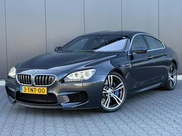 BMW 6-serie Gran Coupé M6 561PK - B&O - Carbon - Led - Volle Uitvoering. Kenteken: 3-TNT-00; Merk: BMW; Model: 6-serie Gran Coupé; APK tot: 09-07-2026; Tellerstand: 188431 KM; Carrosserievorm: Sedan; Aantal deuren: 4; Brandstofsoort: Benzine; Bouwjaar: 2014; Transmissie: Automaat; Kleur: grijs Metallic; Bekleding: Leder; Kleur interieur: bruin; Motorinhoud: 4395 cc; Aantal cilinders: 8; Motorcode: S63B44B; Vermogen: 412 kW / 561pk; Ledig gewicht: 1850 kg; Aantal zitplaatsen: 4; Verbruik: 9.9 l/100 km; BTW/Marge: Marge, de BTW is niet aftrekbaar; Lengte: 501 cm; Hoogte: 1393 cm; Aantal sleutels: 2; Onderhoudshistorie aanwezig: Ja; Motorrijtuigenbelasting: € 333 - 365 per kwartaal; Emissieklasse: Euro 5. Pakket: Assistentie Pakket. Rijstrooksensor. Comfort. Boordcomputer; Cruise control; Regensensor. Exterieur. Adaptief demping systeem; Buitenspiegel rechts; Buitenspiegels elektrisch inklapbaar; Buitenspiegels elektrisch verstel- en verwarmbaar; Centrale vergrendeling met...