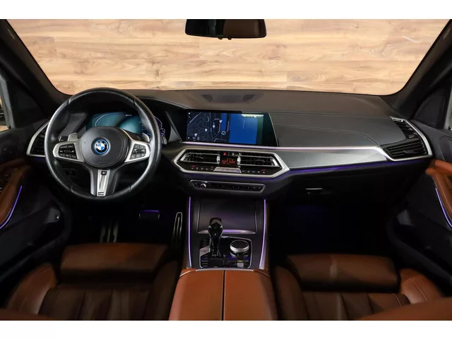 BMW X5 xDrive45e M-Sport|Individual|Tartufo|Skylounge|HUD|360|. BMW X5 xDrive45e M-Sport|Individual|Tartufo|Skylounge|HUD|360|. Merk: BMW; Model: X5; Tellerstand: 55986 KM; Carrosserievorm: SUV; Aantal deuren: 5; Brandstofsoort: Hybride (Elektrisch/Benzine); Bouwjaar: 2021; Transmissie: Automaat; Kleur: zwart; Kleurnaam: Carbonschwarz Metallic; Bekleding: Leder; Kleur interieur: bruin; Interieurnaam: Individual Tartufo; Motorinhoud: 2998 cc; Aantal cilinders: 6; Vermogen: 289 kW / 394pk; Ledig gewicht: 2410 kg; Aantal zitplaatsen: 5; Verbruik: 1.2 l/100 km; BTW/Marge: BTW aftrekbaar, de prijs is inclusief BTW; Aantal sleutels: 2; Onderhoudshistorie aanwezig: Dealer onderhouden. Pakket: Audio Media Pack. Audio installatie; DAB; Draadloze telefoonlader; WiFi. Pakket: CoPilot Pack. Cruise control adaptief met Stop&Go en stuurhulp; Elektrisch bedienbare achterklep; Elektrisch bedienbare achterklep met sensorsturing; Keyless entry; Kruisend verkeer detectie; Rijstrooksensor met correctie...