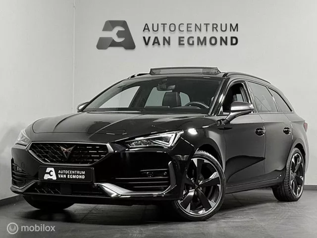 CUPRA Leon Sportstourer 1.5 eTSI | PANO | CARPLAY| AD. CRUIS. Kenteken: HVP-19-G; Merk: CUPRA; Model: Leon Sportstourer; APK tot: 23-05-2028; Tellerstand: 7784 KM; Carrosserievorm: Station; Aantal deuren: 5; Brandstofsoort: Hybride (Elektrisch/Benzine); Bouwjaar: 2024; Transmissie: Automaat; Kleur: zwart Metallic; Bekleding: Leder/Stof; Kleur interieur: zwart; Motorinhoud: 1498 cc; Aantal cilinders: 4; Vermogen: 110 kW / 150pk; Ledig gewicht: 1620 kg; Max. trekgewicht: 1500 kg; Aantal zitplaatsen: 5; Verbruik: 0.4 l/100 km; BTW/Marge: BTW aftrekbaar, de prijs is inclusief BTW; Aantal sleutels: 2; Onderhoudshistorie aanwezig: Ja; Motorrijtuigenbelasting: € 200 - 219 per kwartaal. Comfort. Cruise control; Regensensor. Exterieur. Achterspoiler; Buitenspiegels elektrisch inklapbaar; Buitenspiegels elektrisch verstel- en verwarmbaar; Buitenspiegels met verlichting; Bumpers in carrosseriekleur; Dakrails; Dimlichten automatisch; Keyless entry; LED achterlichten; LED dagrijverlichting...