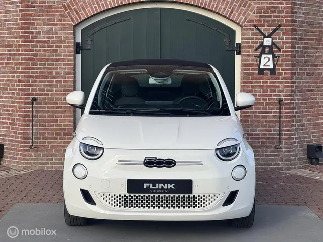 Fiat 500e La Prima Icon 42 kWh Cabrio Led, Apple Carplay, Adapt cruise, 17". Kenteken: GDT-08-P; Merk: Fiat; Model: 500e; APK tot: 10-05-2026; Tellerstand: 37367 KM; Carrosserievorm: Cabrio; Aantal deuren: 2; Brandstofsoort: Elektrisch; Accucapaciteit: 42 kWh; Bouwjaar: 2022; Transmissie: Automaat; Kleur: wit; Motorcode: 46348460; Vermogen: 87 kW / 118pk; Ledig gewicht: 1305 kg; Aantal zitplaatsen: 4; BTW/Marge: Marge, de BTW is niet aftrekbaar; Lengte: 363 cm; Breedte: 168 cm; Hoogte: 1529 cm; Motorrijtuigenbelasting: € 48 - 52 per kwartaal; Emissieklasse: Euro Z. Pakket: Media Pack. Apple Carplay/Android Auto; DAB; Draadloze telefoonlader. Pakket: Media Winter Pack. Apple Carplay/Android Auto; Buitenspiegels elektrisch verstel- en verwarmbaar; DAB; Draadloze telefoonlader; Voorstoelen verwarmd. Pakket: Technology Pack. Achteruitrijcamera; Cruise control adaptief; Dodehoek detectie; File assistent; Parkeersensor voor. Comfort. Boordcomputer; Cruise control; Regensensor. Exterieur. ...