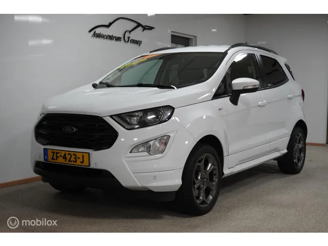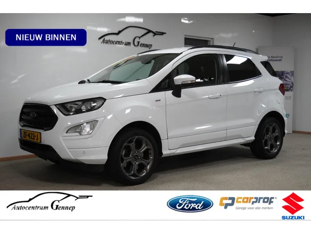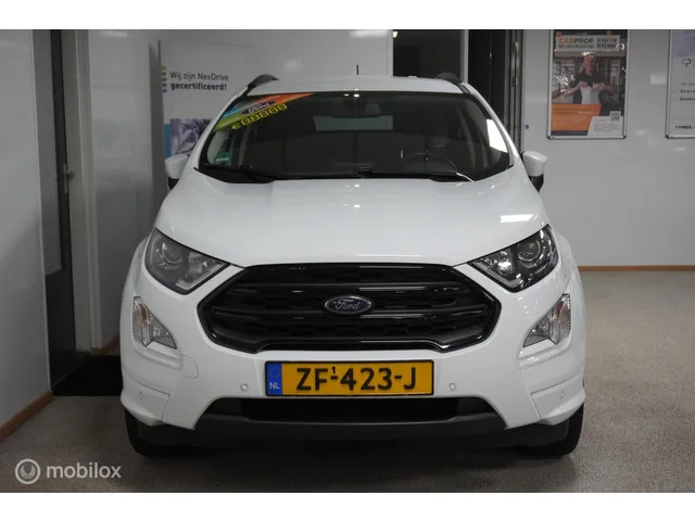 Ford EcoSport 1.0 EcoBoost ST-Line | winter pack |. Kenteken: ZF-423-J; Merk: Ford; Model: EcoSport; APK tot: 10-03-2027; Tellerstand: 117616 KM; Carrosserievorm: SUV; Aantal deuren: 5; Brandstofsoort: Benzine; Bouwjaar: 2018; Transmissie: Handgeschakeld; Kleur: wit; Bekleding: Leder/Alcantara; Kleur interieur: zwart; Motorinhoud: 998 cc; Aantal cilinders: 3; Motorcode: M1JU; Vermogen: 92 kW / 125pk; Ledig gewicht: 1249 kg; Max. trekgewicht: 900 kg; Aantal zitplaatsen: 5; Verbruik: 5.3 l/100 km; BTW/Marge: Marge, de BTW is niet aftrekbaar; Aantal sleutels: 2; Onderhoudshistorie aanwezig: Dealer onderhouden; Motorrijtuigenbelasting: € 172 - 188 per kwartaal; Emissieklasse: Euro 6. Pakket: Parking Pack. Achteruitrijcamera; Dodehoek detectie. Pakket: Premium Audio Navigation Pack. Apple Carplay/Android Auto; Audio installatie premium; DAB; Navigatiesysteem full map; Spraakbediening. Pakket: Winter pack. Ruitensproeiers/wisserbladen verwarmbaar; Stuur verwarmd; Verwarmde voorruit...