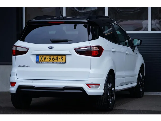 Ford EcoSport 1.0 EcoBoost ST-Line, 1e eig. CarPlay, keyless. Kenteken: XV-964-K; Merk: Ford; Model: EcoSport; APK tot: 21-01-2027; Tellerstand: 50718 KM; Carrosserievorm: SUV; Aantal deuren: 5; Brandstofsoort: Benzine; Bouwjaar: 2019; Transmissie: Handgeschakeld; Kleur: wit; Bekleding: Leder/Alcantara; Motorinhoud: 998 cc; Aantal cilinders: 3; Motorcode: M1JU; Vermogen: 92 kW / 125pk; Ledig gewicht: 1249 kg; Max. trekgewicht: 900 kg; Aantal zitplaatsen: 5; Verbruik: 5.3 l/100 km; BTW/Marge: BTW aftrekbaar, de prijs is inclusief BTW; Lengte: 433 cm; Breedte: 177 cm; Aantal sleutels: 2; Onderhoudshistorie aanwezig: Dealer onderhouden; Motorrijtuigenbelasting: € 172 - 188 per kwartaal; Emissieklasse: Euro 6. Pakket: Design Pack. Extra getint glas achter. Comfort. Boordcomputer; Cruise control; Regensensor. Exterieur. Achterruitwisser; Achterspoiler; Andere dakkleur; Buitenspiegels elektrisch inklapbaar; Buitenspiegels elektrisch verstelbaar; Buitenspiegels in carrosseriekleur...