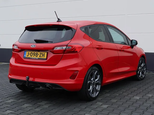 Ford Fiesta 1.0 EcoBoost Automaat 125pk ST-Line | B&O sound | Camera | Trekhaak. Kenteken: J-098-ZH; Merk: Ford; Model: Fiesta; APK tot: 13-11-2026; Tellerstand: 131954 KM; Carrosserievorm: Hatchback; Aantal deuren: 5; Brandstofsoort: Benzine; Bouwjaar: 2020; Transmissie: Automaat; Kleur: rood; Kleurnaam: Race Red; Bekleding: Stof; Kleur interieur: zwart; Motorinhoud: 998 cc; Aantal cilinders: 3; Motorcode: B7JC; Vermogen: 91 kW / 124pk; Ledig gewicht: 1136 kg; Max. trekgewicht: 1000 kg; Aantal zitplaatsen: 5; Verbruik: 4.6 l/100 km; BTW/Marge: BTW aftrekbaar, de prijs is inclusief BTW; Lengte: 407 cm; Breedte: 176 cm; Aantal sleutels: 2; Onderhoudshistorie aanwezig: Dealer onderhouden; Motorrijtuigenbelasting: € 140 - 154 per kwartaal; Emissieklasse: Euro 6. Pakket: Driver Assistance Pack 2. Achteruitrijcamera; Autonomous Emergency Braking; Cruise control adaptief met Stop&Go; Dodehoek detectie; Parkeer assistent; Parkeersensor voor; Verkeersbord detectie. Comfort. Boordcomputer...