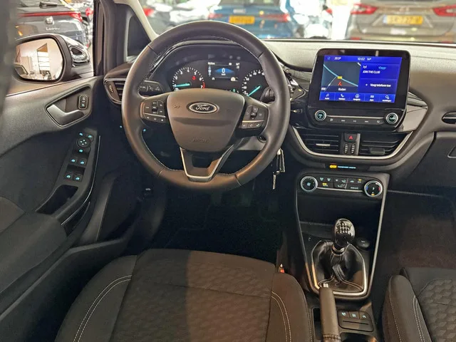 Ford Fiesta 1.0 EcoBoost Titanium|Navi|ECC|Cruise|PDC|. Kenteken: R-967-ZR; Merk: Ford; Model: Fiesta; APK tot: 29-12-2026; Tellerstand: 84253 KM; Carrosserievorm: Hatchback; Aantal deuren: 5; Brandstofsoort: Benzine; Bouwjaar: 2022; Transmissie: Handgeschakeld; Kleur: zwart Metallic; Motorinhoud: 998 cc; Aantal cilinders: 3; Motorcode: Y7JA; Vermogen: 74 kW / 101pk; Ledig gewicht: 1101 kg; Max. trekgewicht: 750 kg; Aantal zitplaatsen: 5; Verbruik: 5.3 l/100 km; BTW/Marge: BTW aftrekbaar, de prijs is inclusief BTW; Lengte: 409 cm; Breedte: 176 cm; Aantal sleutels: 2; Onderhoudshistorie aanwezig: Ja; Motorrijtuigenbelasting: € 145 - 158 per kwartaal; Emissieklasse: Euro 6. Comfort. Boordcomputer; Cruise control; Regensensor. Exterieur. Buitenspiegels elektrisch verstelbaar; Buitenspiegels in carrosseriekleur; Buitenspiegels met verlichting; Buitenspiegels verwarmbaar; Centrale vergrendeling met afstandsbediening; Dimlichten automatisch; LED achterlichten; LED dagrijverlichting; LED...