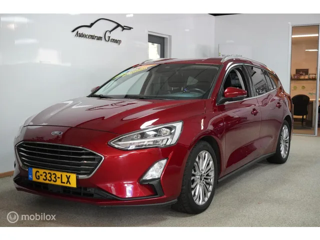 Ford Focus Wagon 1.0 EcoBoost Titanium Business |. Kenteken: G-333-LX; Merk: Ford; Model: Focus Wagon; APK tot: 22-10-2026; Tellerstand: 168548 KM; Carrosserievorm: Station; Aantal deuren: 5; Brandstofsoort: Benzine; Bouwjaar: 2019; Transmissie: Handgeschakeld; Kleur: rood Metallic; Bekleding: Stof; Kleur interieur: zwart; Motorinhoud: 999 cc; Aantal cilinders: 3; Motorcode: B7DA; Vermogen: 92 kW / 125pk; Ledig gewicht: 1283 kg; Max. trekgewicht: 1000 kg; Aantal zitplaatsen: 5; Verbruik: 4.9 l/100 km; BTW/Marge: Marge, de BTW is niet aftrekbaar; Aantal sleutels: 2; Onderhoudshistorie aanwezig: Dealer onderhouden; Motorrijtuigenbelasting: € 199 - 217 per kwartaal; Emissieklasse: Euro 6. Pakket: Audio pakket. Audio installatie premium; DAB. Pakket: Design Pack. Extra getint glas achter; LED koplampen. Pakket: Winter pack. Ruitensproeiers/wisserbladen verwarmbaar; Stuur verwarmd; Verwarmde voorruit; Voorstoelen verwarmd. Comfort. Boordcomputer; Cruise control; Regensensor. Exterieur. ...