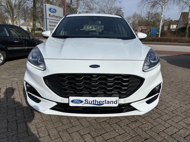 18 inch lichtmetalen velgen 5x2-spaaks in Rock Metallic, Handsfree elektrisch bedienbare achterklep, Achterspoiler, Automatisch inschakelende dimlichten, chroom delen exterieur, Dakreling Zwart, Dubbele uitlaat achter - Sportief Design, Elektrisch verstelbare, verwarmbare en inklapbare buitenspiegels met instapverlichting, FordKeyless Entry op de voorportieren (incl. motion sensor in de sleutel), Frozen White unilak, koplampreiniging, LED achterlichten, LED dagrijverlichting, LED mistlampen voor - uniek design, Privacy Glass, Regensensor, Sportieve unieke ST-Line zijskirts