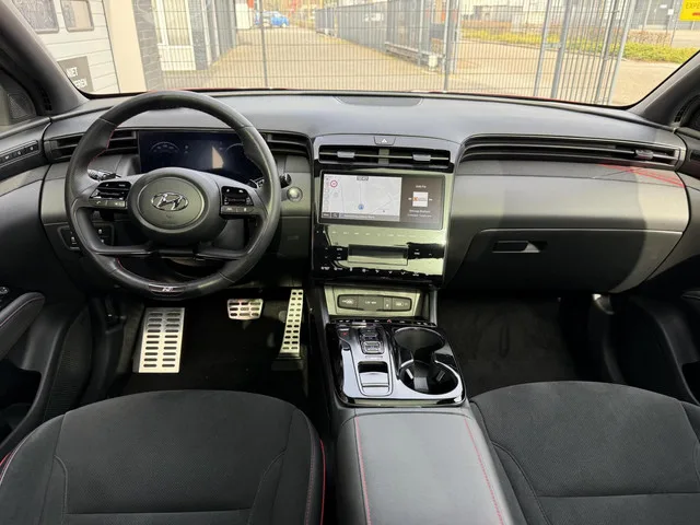 Hyundai Tucson 1.6 T-GDI PHEV N Line Sky 4WD PANORAMADAK TREKHAAK. Algemene gegevens. Kenteken: JZT-89-X. Tellerstand: 31398 KM. Carrosserievorm: SUV. Aantal deuren: 5. Brandstofsoort: Hybride (Elektrisch/Benzine). Bouwjaar: 2023. Transmissie: Automaat. Kleur: Rood Metallic. Interieur: Zwart. Bekleding: Leder/Alcantara. Aantal maanden fabrieksgarantie: 60. Technische gegevens. Motorinhoud: 1598 cc. Aantal cilinders: 4. Vermogen: 195 kW / 266pk. Koppel: 265Nm. Ledig gewicht: 1793 kg. Max. trekgewicht: 1350 kg. Emissieklasse: Euro 6. Acceleratie (0-100 km/h): 8.2 seconden. Topsnelheid: 191 km/h. Gemiddeld verbruik (gecombineerd): 1.4 l/100km. Functionaliteit. Lengte (cm): 451 cm. Hoogte (cm): 1650 cm. Breedte (cm): 187 cm. Financiële gegevens. Motorrijtuigenbelasting: € 333 - 365 per kwartaal. Oorspronkelijke cataloguswaarde: € 49950 (incl. 21% BTW, incl. BPM). BTW/Marge: Marge, de BTW is niet aftrekbaar. Comfort. Boordcomputer; Regensensor. Exterieur. Buitenspiegels elektrisch...
