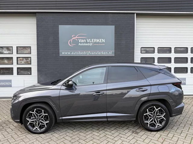Hyundai Tucson 1.6 T-GDI PHEV N Line Sky 4WD FULL OPTIONS. Algemene gegevens. Kenteken: JJG-56-N. Tellerstand: 24871 KM. Carrosserievorm: SUV. Aantal deuren: 5. Brandstofsoort: Hybride (Elektrisch/Benzine). Bouwjaar: 2024. Transmissie: Automaat. Kleur: Grijs Metallic. Interieur: Zwart. Bekleding: Leder/Alcantara. Onderhoudshistorie aanwezig: Dealer onderhouden. Aantal maanden fabrieksgarantie: 60. Technische gegevens. Motorinhoud: 1598 cc. Aantal cilinders: 4. Vermogen: 195 kW / 266pk. Koppel: 265Nm. Ledig gewicht: 1793 kg. Max. trekgewicht: 1350 kg. Emissieklasse: Euro 6. Acceleratie (0-100 km/h): 8.2 seconden. Topsnelheid: 191 km/h. Gemiddeld verbruik (gecombineerd): 1.4 l/100km. Functionaliteit. Lengte (cm): 451 cm. Hoogte (cm): 1650 cm. Breedte (cm): 187 cm. Financiële gegevens. Motorrijtuigenbelasting: € 240 - 266 per kwartaal. Oorspronkelijke cataloguswaarde: € 50949 (incl. 21% BTW, incl. BPM). BTW/Marge: Marge, de BTW is niet aftrekbaar. Comfort. Boordcomputer; Regensensor. ...