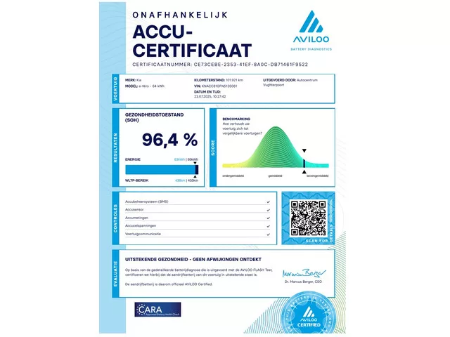 bouwjaar 2022! Aviloo Accutestrapport aanwezig, SOH/state of health 96,4 % Grote 64kw Accu --WLTP rijbereik 450km-- 3 Fase laden/ ook snelladen, Luxe uitvoering: Adaptieve cruise control, standkachel/voorverwarminstallatie, Kia live, half-lederen bekleding & stoel+stuurverwarming, Lane-assist(LDW),Groot 11"scherm met Apple carplay/Android auto, Chrome deurgrepen, parkeercamera/sensoren(PDC), 17"velgen, Kia dealer-historie aanwezig (foto's) Wij bieden u diverse aflever-/ onderhoudspakketten ter behoud Kia-fabrieksgarantie t/m 03-2032. Modeljaar: 2019; 4WD; 150 kW; 395 Nm; Gewicht: 1.712kg; Laadvermogen: 518kg; GVW: 2.230kg; Max. trekgewicht: 300kg; LxBxH: 438x181x157cm; Wielbasis: 270cm; Aanwezige accu: gekocht; Accu: 64kWh, 96%, Type lithium-ion; Accu laden: Type 2, 3-fasen, 11.3 kW; Accu snelladen: Combined Charging System, 100 kW; Actieradius: 455 km; 0-100 km/h: 7,8s; Topsnelheid: 167km/u; Interieurkleur: zwart; 5 zitplaatsen; 0 g/km CO₂; Energielabel A; APK: tot sep. 2027; 2...