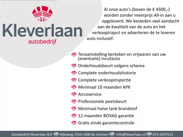 Bosch Car Service Kleverlaan Limmen is hét adres voor alle merken auto’s. Onze occasions worden afgeleverd inclusief 12 maanden Bovag garantie, verkoopinspectie, onderhoudsbeurt, onderhoudshistorie, aircoservice, professionele poetsbeurt, minimaal 10 maanden APK en een gratis uitgebreide garantiecheck voor het verstrijken van de garantieperiode. Wij adverteren met all-in prijzen (alleen voor grijs kenteken auto's gelden afleverpakket-prijzen). Je kunt uiteraard nog kiezen voor de aanvullende Excellent garantie tot 24 maanden (vraag naar de voorwaarden) voor nog meer zekerheid of mogelijkheid voor reparatie bij je in de buurt. Hoewel aan de informatie van deze advertentie de grootst mogelijke zorg wordt besteed, kan Kleverlaan BV niet aansprakelijk worden gesteld voor eventuele onjuiste informatie van welke aard dan ook. Informeer bij onze verkoopadviseurs voor de exacte uitvoering en beschikbaarheid van de auto. Wij verwelkomen u graag in onze showroom voor een kennismaking en een...
