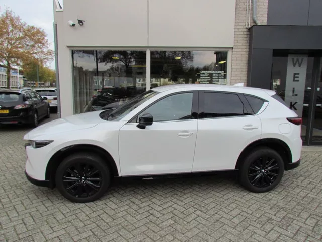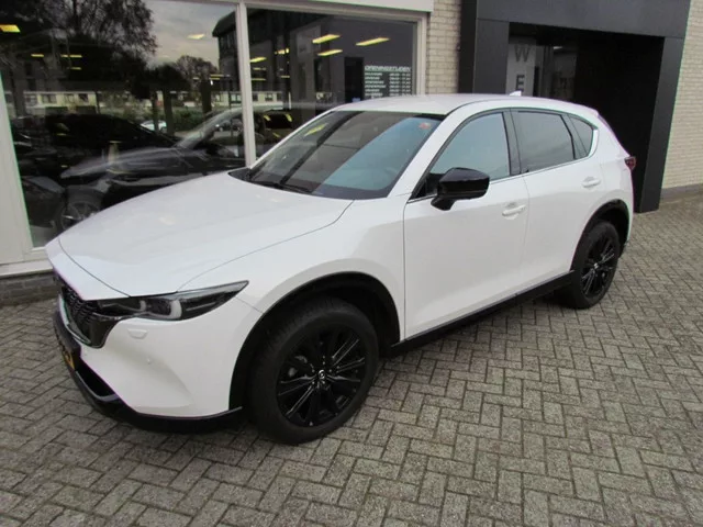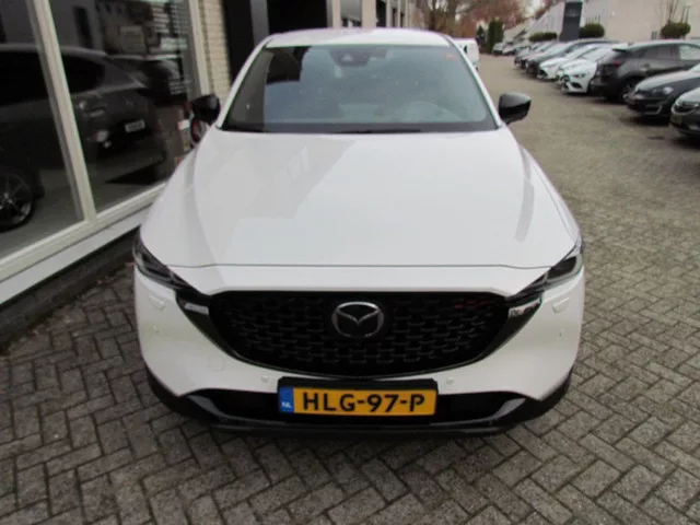 Een zo goed als nieuwe Mazda CX-5 met nog maar 28.000km op de teller. Compleet van de 1e eigenaar en netjes zijn 1e beurt gehad, alles zit er volledig bij. Het betreft de 165pk sterke M-Hybrid benzine motor gekoppeld aan een automaat in de kleur Rhodium White. Het Homura pakket bestaat uit: 19 inch glans zwarten velgen, adaptieve cruise control, climate control, rondom camera, parkeersensoren voor en achter, keyless entry, zwart leren bekleding, BOSE audiosysteem, MZD connect inclusief Bluetooth, Apple Carplay en nog vele andere luxe. Extra is er later een afneembare trekhaak 13-polig op gemonteerd en 19 inch all season banden. Getoonde prijzen zijn complete prijzen, inclusief APK, onderhoud en garantie. 121 kW; 4 cilinders; 1.998cc; Gewicht: 1.565kg; 5 zitplaatsen; 6,9 l/100km; 7,2 l/100km; 6,3 l/100km; 156 g/km CO₂; BOVAG Garantie (12 maanden); Wegenbelasting: € 269-€ 297p/kwrt