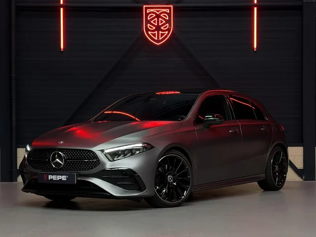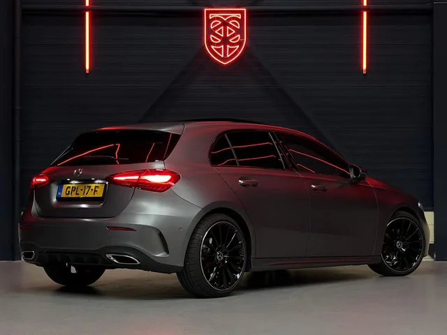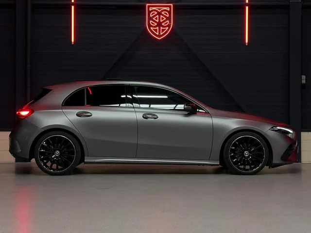Mercedes A-klasse 180 AMG Line |PANO|MATKLEUR|AMBILIGHT|19". Merk: Mercedes; Model: A-klasse; APK tot: 02-06-2027; Tellerstand: 39145 KM; Carrosserievorm: Hatchback; Aantal deuren: 5; Brandstofsoort: Benzine; Bouwjaar: 2023; Transmissie: Automaat; Kleur: grijs; Kleurnaam: Mountaingrey Magno; Bekleding: Leder/Alcantara; Kleur interieur: zwart; Motorinhoud: 1332 cc; Aantal cilinders: 4; Motorcode: 282814; Vermogen: 100 kW / 136pk; Ledig gewicht: 1340 kg; Max. trekgewicht: 1400 kg; Aantal zitplaatsen: 5; Verbruik: 5.9 l/100 km; BTW/Marge: Marge, de BTW is niet aftrekbaar; Lengte: 445 cm; Breedte: 185 cm; Aantal sleutels: 2; Onderhoudshistorie aanwezig: Ja; Motorrijtuigenbelasting: € 95 - 103 per kwartaal; Emissieklasse: Euro 6. Bijzondere opties & accessoires. AMG-styling; Achteruitrijcamera; Apple Car Play | Android Auto; Buitenspiegels elektrisch verstel- en verwarmbaar; Elektrisch glazen panorama-dak; Extra getint glas achter; LED koplampen adaptief; Lichtmetalen velgen multi-spaaks...