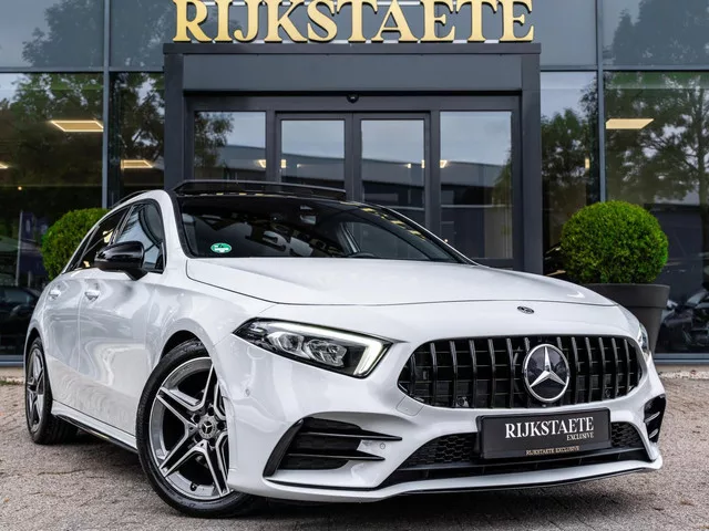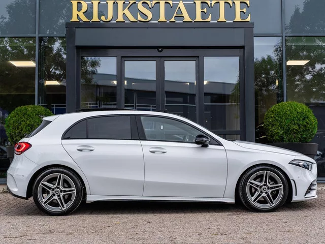 Mercedes A-klasse A200 AMG|PANO|CAMERA|18'|CARPLAY|SFEERVER. Kenteken: TV-035-F; Merk: Mercedes; Model: A-klasse; APK tot: 24-04-2027; Tellerstand: 84654 KM; Carrosserievorm: Hatchback; Aantal deuren: 5; Brandstofsoort: Benzine; Bouwjaar: 2018; Transmissie: Automaat; Kleur: wit; Bekleding: Leder/Alcantara; Kleur interieur: zwart; Motorinhoud: 1332 cc; Aantal cilinders: 4; Motorcode: 282914; Vermogen: 120 kW / 163pk; Ledig gewicht: 1275 kg; Max. trekgewicht: 1600 kg; Aantal zitplaatsen: 5; Verbruik: 5.9 l/100 km; BTW/Marge: Marge, de BTW is niet aftrekbaar; Breedte: 180 cm; Aantal sleutels: 2; Onderhoudshistorie aanwezig: Dealer onderhouden; Motorrijtuigenbelasting: € 190 - 207 per kwartaal; Emissieklasse: Euro 6. Pakket: AMG Line. AMG-styling; Aluminium interieur afwerking; Chroom delen exterieur; Electronic climate control; Kunstlederen bekleding; Kunstlederen/stof bekleding; LED koplampen; Side-skirts; Sportstoelen; Sportstuur; Sportstuur leder; Stuur leder; Variabele...