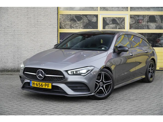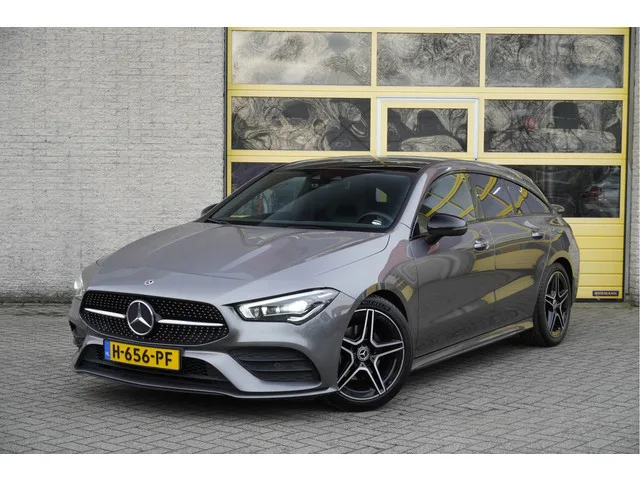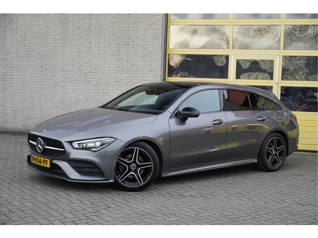 Mercedes-Benz CLA-klasse Shooting Brake Automaat met de zeer luxe aanwezige opties als Lichtmetalen velgen | Led dagrijverlichting | Led koplampen | Led achterlichten | Keyless entry | Panoramadak | Parkeersensoren | Elektrische achterklep | Burmester Audio Systeem | Dashboard verlichting | Navigatiesysteem | Virtual cockpit | Climate control | Cruise control | Sportstoelen | Elektrische verstelbare voorstoelen met geheugen | Zwarte hemel | Extra getint glas. 7 versn., Automaat; Modeljaar: 2019; Voorwielaandrijving; 100 kW; 200 Nm; 4 cilinders; 1.332cc; Gewicht: 1.340kg; Laadvermogen: 675kg; GVW: 2.015kg; Max. trekgewicht: 1.400kg; LxBxH: 470x186x144cm; Wielbasis: 273cm; 43l tank; 0-100 km/h: 9,2s; Topsnelheid: 215km/u; Interieur: zwart, Leder/alcantara; 5 zitplaatsen; 5,5 l/100km; 7,3 l/100km; 4,4 l/100km; 142 g/km CO₂; Energielabel D; Euro 6; Dealer onderhouden (onderhoudsboekjes aanwezig); Aantal eigenaren: 2; APK bij aflevering; Wegenbelasting: € 199-€ 217p/kwrt; vanaf € 358 p/m...