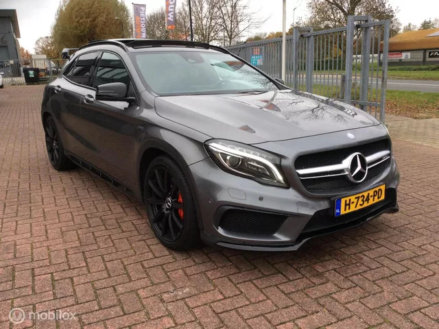 Mercedes GLA-klasse AMG 45 4MATIC Premium Panorama Memory St. Kenteken: H-734-PD; Merk: Mercedes; Model: GLA-klasse; APK tot: 04-11-2026; Tellerstand: 142004 KM; Carrosserievorm: SUV; Aantal deuren: 5; Brandstofsoort: Benzine; Bouwjaar: 2017; Transmissie: Automaat; Kleur: grijs Metallic; Bekleding: Leder/Alcantara; Kleur interieur: zwart; Interieurnaam: Sportstoelen AMG; Motorinhoud: 1991 cc; Aantal cilinders: 4; Motorcode: 133980; Vermogen: 280 kW / 381pk; Ledig gewicht: 1485 kg; Aantal zitplaatsen: 5; Verbruik: 7.4 l/100 km; BTW/Marge: Marge, de BTW is niet aftrekbaar; Breedte: 180 cm; Hoogte: 1474 cm; Aantal sleutels: 1; Onderhoudshistorie aanwezig: Ja; Motorrijtuigenbelasting: € 243 - 268 per kwartaal; Emissieklasse: Euro 6; Velgmaat: 19 inch. Pakket: AMG exclusiefpakket. Aluminium interieur afwerking; Lederen bekleding; Sportstoelen; Sportstuur; Voorstoelen verwarmd. Pakket: Navigatie pakket. DVD speler; Navigatiesysteem full map + hard disk; Spraakbediening. Pakket:...