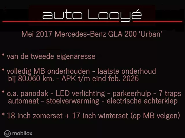 100+ (scherpe !) foto's op onze website . Een hele fraaie, zuivere, en vooral ook een keurig aangeklede MERCEDES-BENZ GLA 200, in de URBAN uitvoering. En URBAN houdt dan in dat er bijvoorbeeld de auto is van sportstoelen, maar ook is voorzien van 18 inch velgen. 200 houdt dan in : 156 PK, 1.6 liter turbo motor. En deze motor is aangevuld met de 7 traps dubbelkoppeling automatische versnellingsbak. Deze GLA is dan nog extra uitgerust met o.a. het altijd aantrekkelijke glazen panorama schuif- / kanteldak, maar ook met stoelverwarming, key-less start, navigatie, parkeersensoren voor en achter, semi-automatisch inparkeren, de volledige LED verlichting, en bijvoorbeeld ook met de automatische achterklep. Tevens de automatische dimmende binnen- en buitenspiegel(s). En wat de buitenspiegels betreft ; deze zijn automatisch en elektrisch inklapbaar. Er wordt gratis (!) een 17 inch winterbandenset meegeleverd. Op originele MB lichtmetalen velgen ! * bij ons nooit extra afleverkosten. * incl....