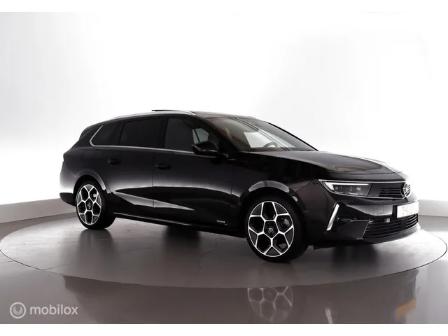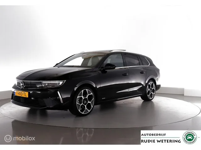 Opel Astra Sports Tourer 1.2 131PK Automaat Level 4 Trekhaak|AGRstoel|acc|cam|lmv18. Kenteken: T-410-TL; Merk: Opel; Model: Astra Sports Tourer; APK tot: 31-08-2027; Tellerstand: 41162 KM; Carrosserievorm: Station; Aantal deuren: 5; Brandstofsoort: Benzine; Bouwjaar: 2023; Transmissie: Automaat 8-Traps; Kleur: zwart Metallic; Kleurnaam: Carbon Black Metallic Kleurcode: (0MM40N9V); Bekleding: Leder/Alcantara; Motorinhoud: 1199 cc; Aantal cilinders: 3; Motorcode: HN05; Vermogen: 96 kW / 131pk; Ledig gewicht: 1321 kg; Max. trekgewicht: 1200 kg; Aantal zitplaatsen: 5; Verbruik: 5.6 l/100 km; BTW/Marge: Marge, de BTW is niet aftrekbaar; Lengte: 465 cm; Breedte: 186 cm; Hoogte: 1474 cm; Aantal sleutels: 2; Onderhoudshistorie aanwezig: Ja; Motorrijtuigenbelasting: € 199 - 217 per kwartaal; Emissieklasse: Euro 6; Bandenmaat voor: 225/40/18; Bandemaat achter: 225/40/18; Wielbasis: 2730 mm. Pakket: Ultimate pakket. Achteruitrij assistent; Audio installatie; Cruise control adaptief met Stop&Go...